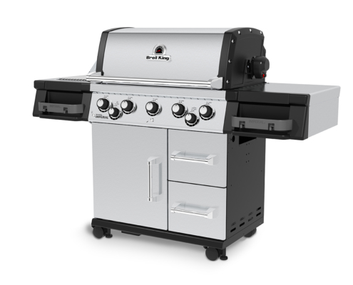 Der Broil King® Imperial™ 590 Pro verfügt über neuartige Edelstahlgussgrillroste, dem Flav-R-Wave™ Verpampfersystem, 5 Edelstahl Dual-Tube™ Brenner, einer Grillflächen-, sowie Kontrollknopfbeleuchtung, Edelstahl Seitenablagen mit integrierter Schublade rechts und einen geschlossenen Unterwagen mit zwei voll ausziehbaren Schubladen.